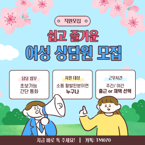 현재 저희와 함께 성장하실 여성 상담원을 긴급 모집 중입니다. 기본적으로 2030 세대의 밝은 에너지를 선호하지만, 사실 가장 중요한 것은 나이가 아닌 **'상대방과 대화를 얼마나 부드럽게 이끌어가는가'**입니다.